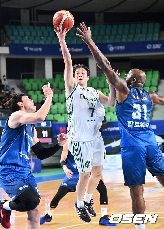 원주 DB 김현호가 대구 한국가스공사 머피 할로웨이의 마크를 피해 골밑슛을 시도하고 있다. 2022.12.09 / foto0307@osen.co.kr