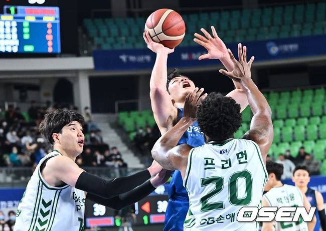대구 한국가스공사 이대헌이 원주 DB 레나드 프리먼과 김종규의 파울에 걸려 볼을 놓치고 있다. 2022.12.09 / foto0307@osen.co.kr
