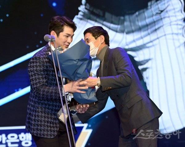 ‘2022 신한은행 SOL KBO리그’ 골든글러브 시상식이 9일 서울 코엑스 오디토리움에서 개최됐다. 유격수 부문 골든글러브를 수상한 LG 오지환이 염경엽 감독의 축하를 받고 있다.