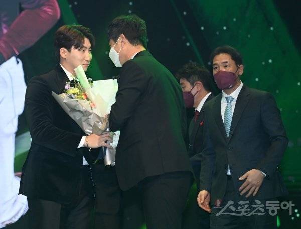 ‘2022 신한은행 SOL KBO리그’ 골든글러브 시상식이 9일 서울 코엑스 오디토리움에서 개최됐다. 외야수 부문 골든글러브를 수상한 KIA 나성범이 김종국 감독의 축하를 받고 있다.