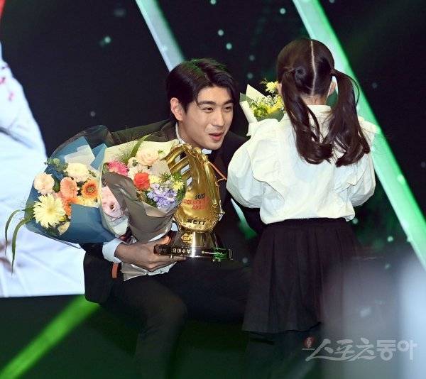 ‘2022 신한은행 SOL KBO리그’ 골든글러브 시상식이 9일 서울 코엑스 오디토리움에서 개최됐다. 외야수 부문 골든글러브를 수상한 키움 이정후가 양의지의 딸에게 축하를 받고 있다.