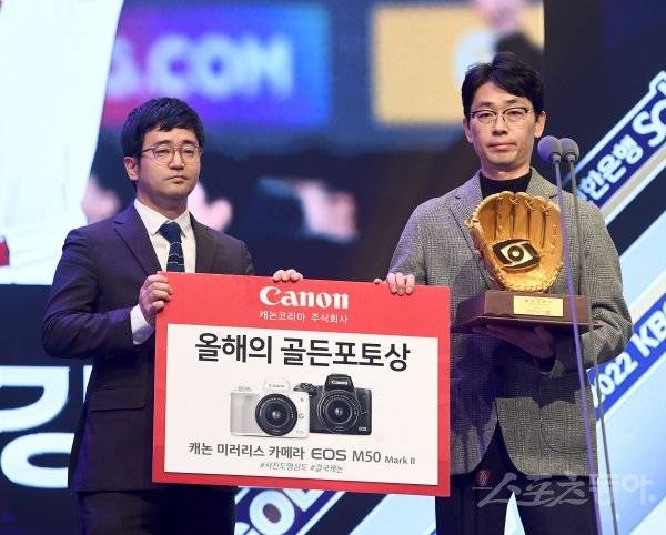 ‘2022 신한은행 SOL KBO리그’ 골든글러브 시상식이 9일 서울 코엑스 오디토리움에서 개최됐다. 한국스포츠사진기자협회가 선정한 골든포토상을 SSG 김강민이 수상했다. SSG 랜더스 맹수환 홍보팀장이 대리수상을 하고 있다.
