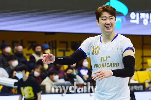 [마이데일리 = 의정부 곽경훈 기자] 우리카드 나경복이 9일 오후 의정부체육관에서 진행된 '도드람 2022-2023 V-리그' KB손해보험-우리카드의 경기에서 세트 스코어 3-1(23-25 25-20 25-20 25-20)로 역전승을 거둔 뒤 기뻐하고 있다.- ⓒ마이데일리(www.mydaily.co.kr). 무단전재&재배포 금지 -
