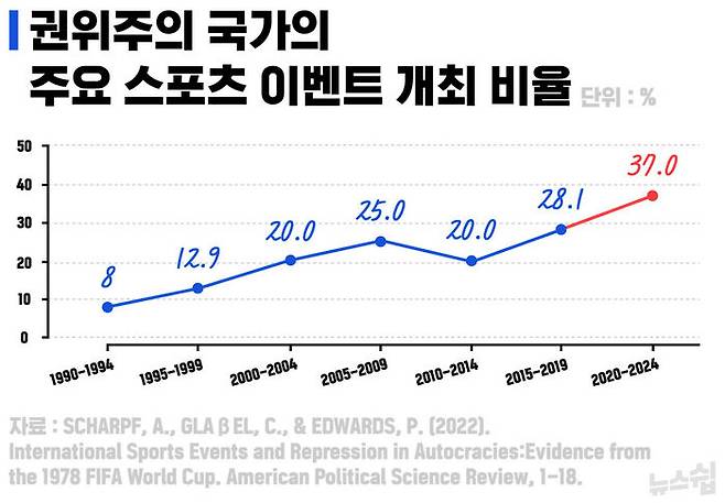 냉전 이후, 권위주의 국가일수록 스포츠 이벤트를 개최하는 경우가 잦아지고 있다는 데이터 분석 결과였다. 1990년대 초반 8%에 불과했지만, 최근 37%로 급증했다.