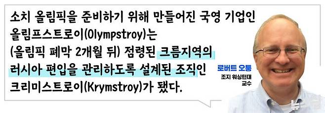 러시아는 2014년 2월 소치 동계 올림픽이 끝난 직후, 우크라이나 영토인 크름 반도를 침공해 강제 병합한다. 그 과정에서 병합된 크름 지역을 관리하던 조직이 크리미스트로이(Krymstroy)다. 그런데 크리미스트로이는 소치 동계 올림픽을 위해 만들어진 국영기업 올림프스트로이(Olympstroy)에서 간판만 바꾼 조직이었다.