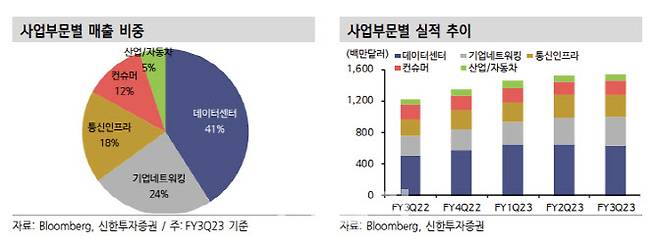 실적이 기대치를 하회한 것은 고객사들의 재고 조정이 본격화하면서 출하 지연 요청 및 주문량 축소 등이 나타났기 때문이다. 예상보다 온프레미스(On-premise) 사업이 부진했지만 스토리지 사업은 전자광학, 스위치 제품 판매 호조로 성장을 견인했다고 분석했다. 재고는 전분기 대비 5% 증가하는 데 그쳤다.