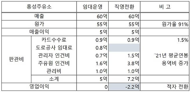 나머지 비용까지 제하면 도로공사 직영 전환시 주유소별 약 2.2억, 임대료 수입 감소까지 포함하면 3억, 결국 양방향에서 매년 6억 정도의 손실이 발생될 것으로 보입니다.