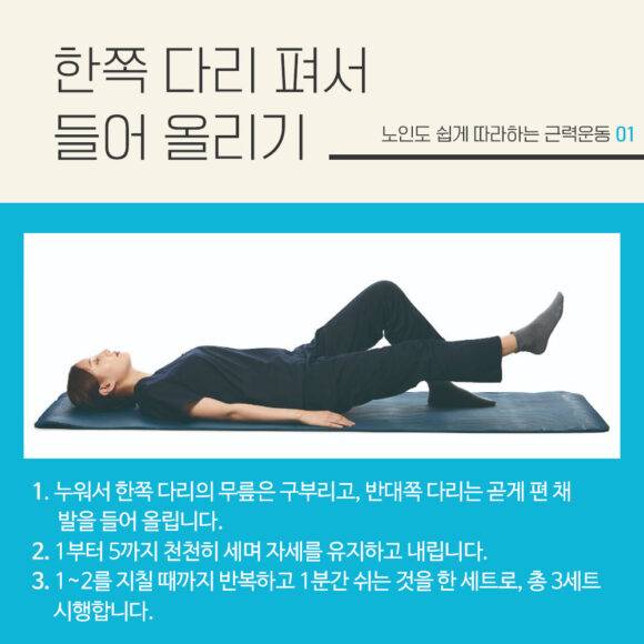 ① 누워서 한쪽 다리의 무릎은 구부리고, 반대쪽 다리는 곧게 편 채 발을 들어 올린다.