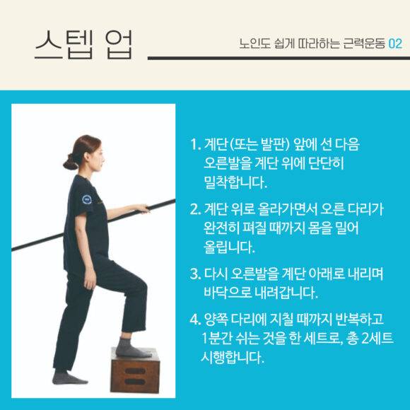 ② 계단 위로 올라가면서 오른 다리가 완전히 펴질 때까지 몸을 밀어 올린다.