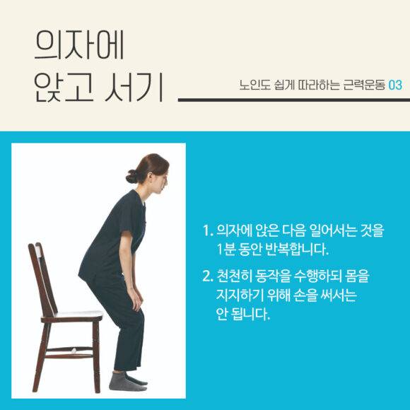 ① 의자에 앉은 다음 일어서는 것을 1분 동안 반복한다.