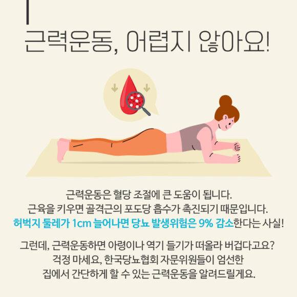 유산소운동뿐만 아니라 근력운동은 혈당 조절에 큰 도움이 된다. 근육을 키우면 골격근의 포도당 흡수가 촉진되기 때문. 허벅지 둘레가 1cm 늘어나면 당뇨 발생위험은 9% 감소한다. 한국당뇨협회 자문위원들이 엄선한 집에서 간단하게 할 수 있는 근력운동을 소개한다.