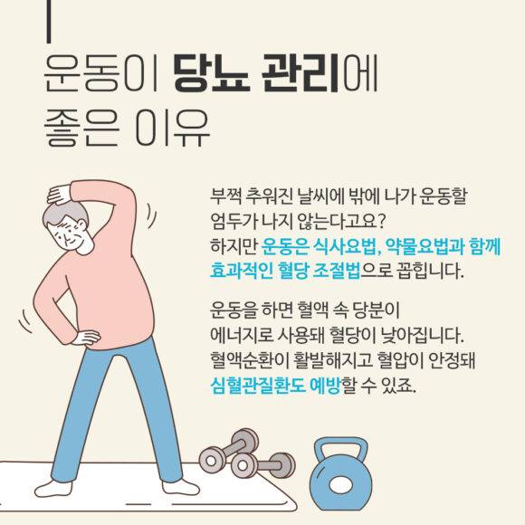 부쩍 추워진 날씨에 밖에 나가 운동할 엄두가 나지 않는다. 하지만 운동은 식사요법, 약물요법과 함께 효과적인 혈당 조절법으로 꼽힌다. 운동을 하면 혈액 속 당분이 에너지로 사용돼 혈당이 낮아지기 때문이다. 혈액순환이 활발해지고 혈압이 안정돼 심혈관질환도 예방할 수 있다.