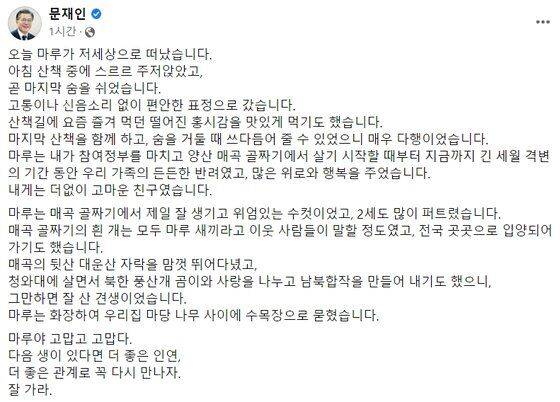 문재인 전 대통령이 반려견 '마루'의 사망 소식을 전했습니다.