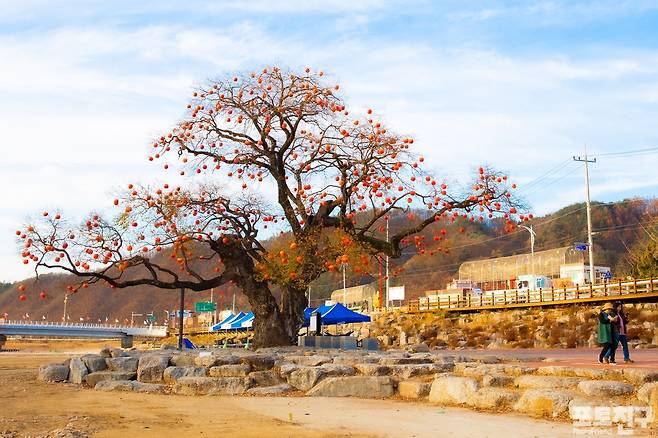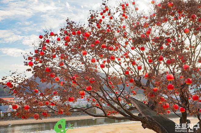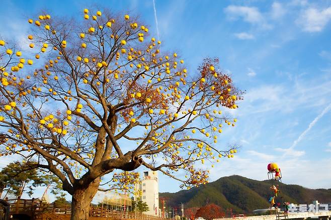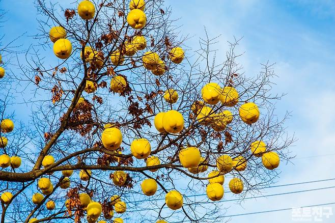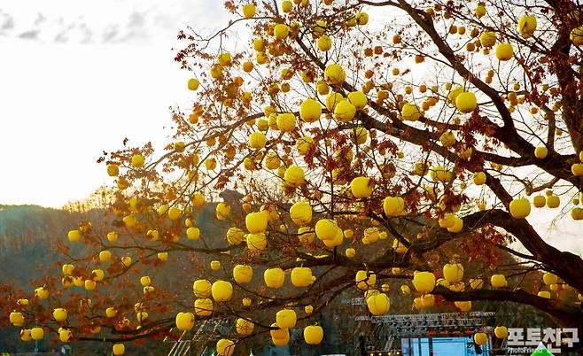노랗고 빨간 사과 등을 나무에 매달아
