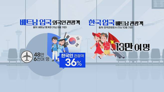 올해 8월까지 베트남을 찾은 외국인은 모두 48만 6천여 명으로 집계됐습니다. 이 가운데 한국인은 17만 3천여 명으로, 36%를 차지해 베트남 방문 외국인 중 가장 많았습니다. 올해 들어 한국을 찾은 베트남 관광객도 10월까지 13만여 명에 달합니다.