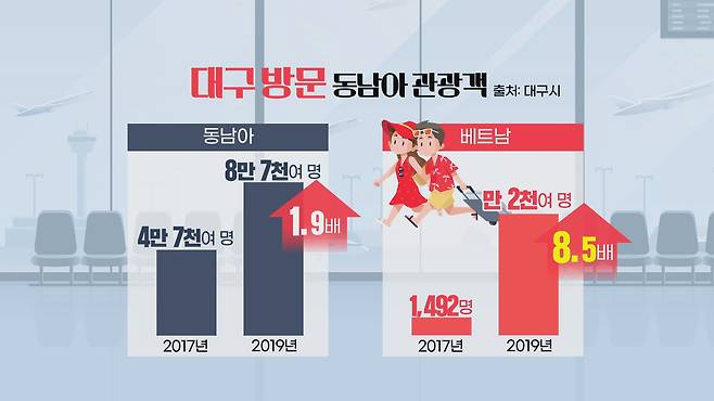 그 결과 2019년 대구를 방문한 동남아 관광객은 8만 7천여 명으로 2년 새 1.9배 늘었습니다. 같은 기간 베트남 관광객은 8.5배나 증가한 것으로 나타났습니다.