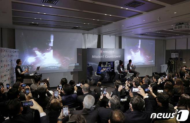 (로이터=뉴스1) 김민수 기자 = 일본 아이스페이스 관계자들이 11일 세계 최초의 달 착륙선 '하쿠토-R' 미션1 의 발사 장면을 생중계로 시청하고 있다. 2022.12.11/뉴스1