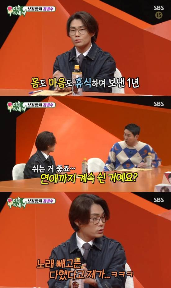 신동엽은 "연애까지 계속 쉬었던 거냐"라며 덧붙였고, 김범수는 "노래 빼고 다 했다고 말씀드리지 않았냐. 다양한 경험을 했다"라며 귀띔했다.