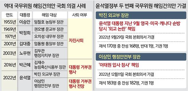 이상민 행정안전부 장관에 대한 해임건의안이 11일 야당 단독으로 처리되면서 정국이 얼어붙고 있다. 1987년 개헌 이후 국회에서 가결된 장관 해임건의안 5건 중 2건이 취임 7개월 차를 맞은 윤석열정부에서 이뤄지면서 여권은 “거대 야당의 의석 횡포”라며 격앙된 반응을 보이고 있다. 더불어민주당은 윤석열 대통령이 거부권을 행사할 경우, 이 장관에 대한 탄핵소추도 불사하겠다며 더욱 압박 수위를 높이고 있다.