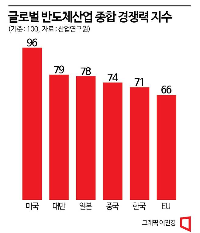최근 산업연구원(KIET)이 내놓은 보고서에 따르면 작년 반도체 산업의 종합 경쟁력을 분석한 결과 미국(96)이 가장 높고 대만(79), 일본(78), 중국(74), 한국(71), EU(66) 순으로 나타났다. 한국은 메모리반도체(87)에서는 높은 경쟁력을 평가받았으나 시스템반도체(63)는 비교 대상국 중 최하위로 평가됐으며, 종합 평가에서도 6개 조사 대상국 중 5위에 그쳤다. 2020년 조사와 비교하면 1년 만에 우리나라와 중국의 순위가 뒤바뀌었다. 2020년 5개 국가 대상 조사에서는 미국(93.4)이 1위였고, 일본(78.4), 대만(75.1), 한국(68.6), 중국(64.3) 순이었다.