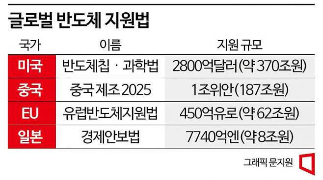 누구보다 미국은 과감하게 움직이고 있다. 미국 의회는 지난 7월 '반도체와 과학법'을 통과시켰다. 중국과의 기술패권 경쟁에서 승리하기 위한 미국의 국가 종합 과학기술 전략을 담은 법이다. 이 법에서 미국은 2800억달러(약 370조원)를 반도체 산업에 투입하기로 했다.