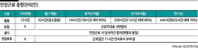 윤석열 정부의 노동시장 개혁 추진을 위해 꾸린 전문가 논의기구인 미래노동시장 연구회가 현행 '주' 단위로 관리하고 있는 연장근로시간을 앞으론 기업 자율에 따라 '월·분기·반기·연' 단위로 관리할 수 있도록 변경할 것을 권고했기 때문이다.