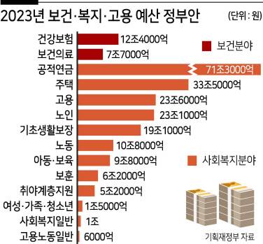 12일 기획재정부 등 재정당국에 따르면 2023년 정부의 ‘보건복지고용’ 예산은 올해보다 4.1% 증가한 226조6000억원이다. 올해 대비 총액은 증가했지만, 전체 예산 지출 증가율(5.2%)에는 못 미치는 증가율이다. 보건복지고용 예산 증가율이 총지출 증가율보다 적었던 것은 지난 2009년 이후 처음이다. 보건복지고용 예산 증가율이 낮아진 건 코로나19 예방접종 등 보건 예산이 올해보다 8.7% 줄어든 탓이 크다. 코로나19 당시 일시적으로 늘렸던 보건 지출 감소를 뺀 사회복지 증가율은 5.6%로 올해 증가율(5.4%)과 내년도 총지출 증가율(5.2%)보다 더 높다는 게 기재부 설명이다.