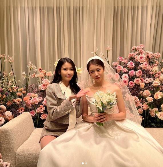 함께 공개된 사진 속에는 신부대기실에서 지연과 사진을 촬영하는 아이유의 모습이 담겼다. 지연은 부케를 들고 환하게 웃고 있고, 아이유도 지연을 손으로 가리키며 절친의 앞날을 축복하고 있다.