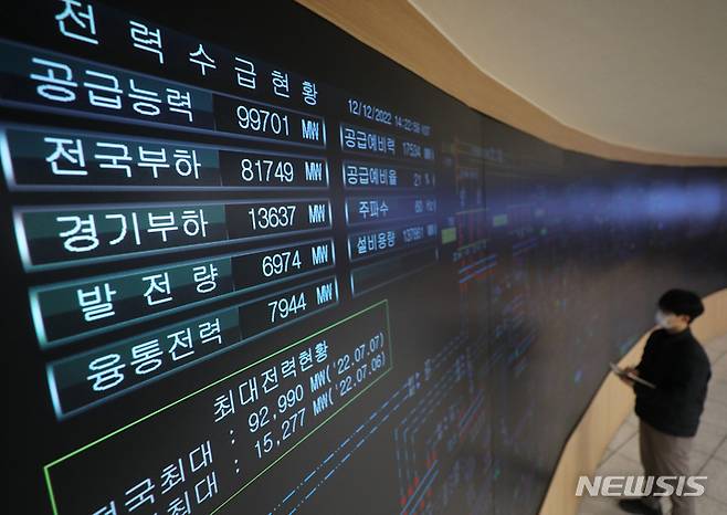 [수원=뉴시스] 김종택 기자 = 12일 오후 경기도 수원시 영통구 한국전력공사 경기지역본부 전력관리처 계통운영센터에서 관계자들이 전력수급현황을 점검하고 있다. 한국전력은 올해 사회적 거리두기 해제에따라 산업용·일반용 전력 수요가 증가해 전력거래량이 역대 최대를 기록할것으로 전망된다고 밝혔다. 2022.12.12. jtk@newsis.com