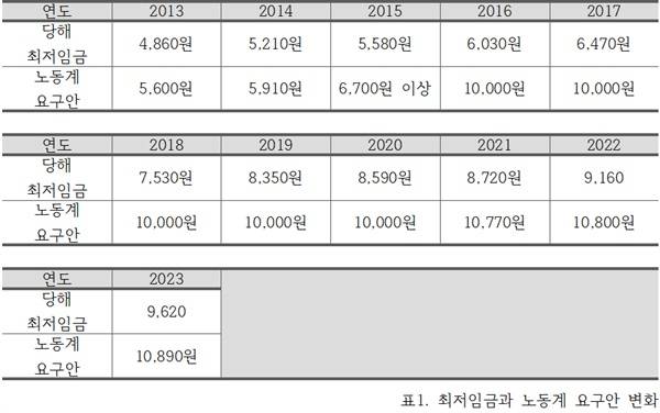 2013년에 결정된 최저임금은 4860원이었는데 당시 민주노총을 비롯한 노동계의 요구는 5600원으로 결정된 최저임금과 1260원밖에 차이가 나지 않았다. 요구된 최저임금의 수준과 결정된 최저임금 그리고 만원 요구의 격차는 매우 컸다.