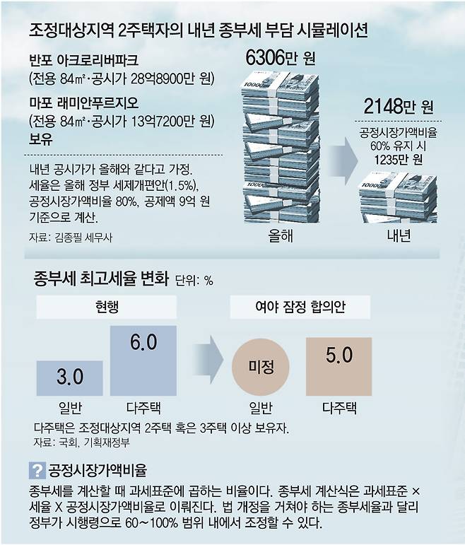 본보가 김종필 세무사에게 의뢰한 종부세 시뮬레이션에 따르면 서울 반포 아크로리버파크(전용면적 84m²)와 마포 래미안푸르지오(84m²)를 보유한 2주택자는 올해 6306만 원의 종부세를 부담했다. 조정대상지역 내 2주택자여서 3.6%의 중과세율을 적용받았다.