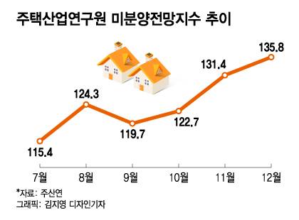 주택산업연구원에 따르면 이달 미분양 물량 전망지수는 135.8이다. 이 지수는 공급자 입장에서 미분양 물량이 얼마나 나올지 전망하는 지표로, 주택사업을 하는 한국주택협회·대한주택건설협회 등 500곳 가량을 상대로 매달 조사한다. 100을 초과하면 미분양 물량이 증가할 것이란 의미인데, 지난 10월 122.7에서 11월 131.4, 이달 135.8로 세달째 증가세다.