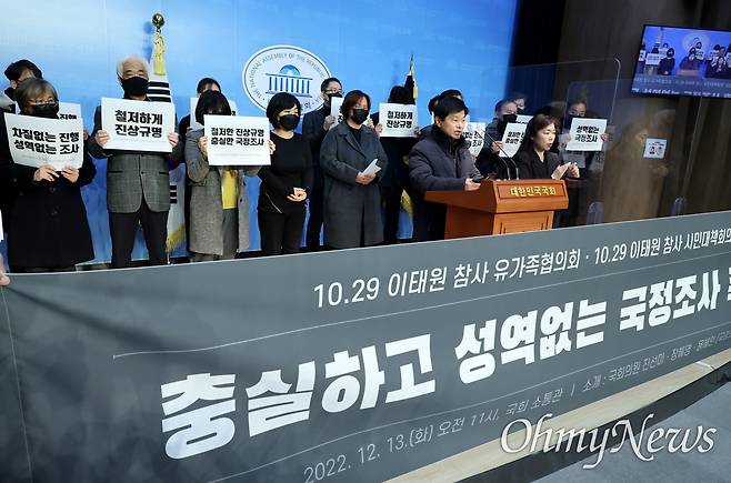 | ▲ 10.29 이태원 참사 유가족협의회와 10.29 이태원 참사 시민대책회의 관계자와 진선미 더불어민주당 의원, 장혜영 정의당 의원, 용혜인 기본소득당 의원이 13일 오전 서울 여의도 국회 소통관에서 기자회견을 열고 이태원 참사의 성역없는 국정조사와 철저한 진상규명을 촉구하고 있다. |
