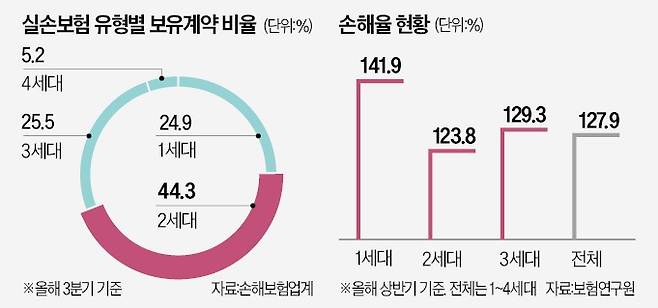 4세대 상품은 1세대에 비해 약 70%, 2세대와 3세대에 비해선 각각 50%, 10% 가까이 보험료가 저렴하다. 금융감독원에 따르면 지난해 6월 기준 40대 남성의 4세대 월평균 실손보험료가 1만1982원이라면 1세대 상품은 4만749원이다. 보험사 실손보험 적자 구조가 이어지면서 내년에 1~3세대 보험료는 더 오를 것으로 예상된다. 업계에선 최소 한 자릿수 후반, 최대 두 자릿수 상승률을 예측하고 있다.