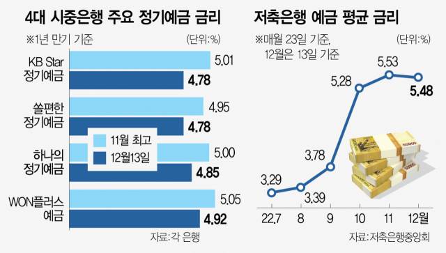 국내 4대 시중은행 예금금리가 5% 밑으로 떨어졌다.