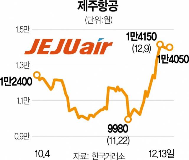 13일 한국거래소에 따르면 제주항공(089590) 주가는 최근 16거래일 동안 40.7% 급등했다. 진에어(272450)는 지난달 28일 1만 3100원에서 이날 1만 5700원으로 11거래일 만에 19.8%, 티웨이항공(091810)은 지난달 23일 1795원에서 이날 1970원으로 9.7% 올랐다.