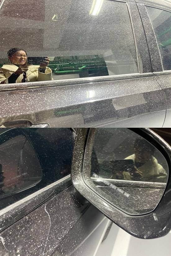 그는 "오늘 미세먼지 눈을 맞아버렸다… 거의 대테러수준 ㅜㅜ"이라고 덧붙이며 더러워진 차에 대한 심경을 표했다.