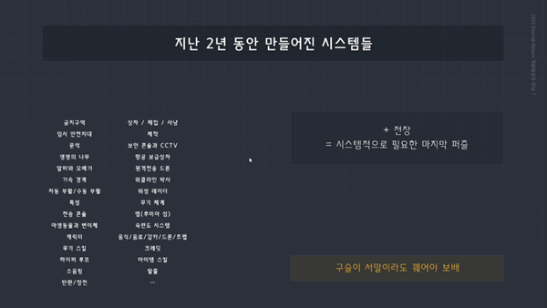 A. 매 패치마다 크고 작은 개선 사항이 상당히 많이 진행 중에 있다. 기술력에 있어 문제는 없지만 시간과 자본적인 문제로 인해 현실적으로 모든 개선을 빠르게 진행할 수는 없다. 따라서 시급한 개선 사항을 우선으로 처리하며 순차적으로 개발을 하고 있다.