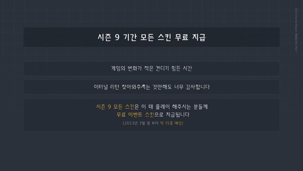 ■ 시즌9 재정비 기간 '15종 무료 스킨 지급한다'