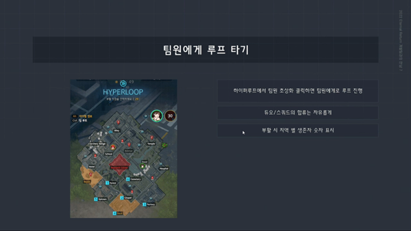 팀원을 하이퍼 루프 목표로 지정할 수 있게 된다. 듀오나 스쿼드에서 아군과 합류하는 과정에서 발생하는 사고를 줄이는 것이 목표다. 보다 자유로운 합류와 더불어 부활 시 지역 별 생존자 숫자도 표시해 준다. 이외에도 튜토리얼 개편, '절'과 '고급 주택가' 지역 비쥬얼 업데이트를 진행한다.