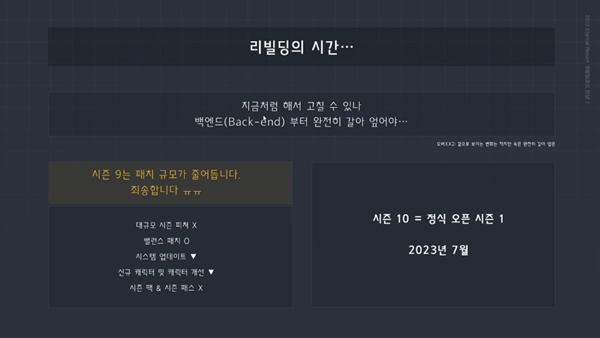 전장은 시스템적으로 필요한 마지막 퍼즐이라고 전하며 추가한 요소들을 제대로 게임에 적용시키는 패치를 진행하는 과정을 거친다. 시즌9는 패치 규모가 줄어든다고 전하며 시스템 업데이트와 신규 캐릭터 및 기존 캐릭터 개선을 위주로 작업한다고 밝혔다.