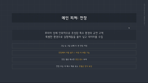 전장은 솔로에서 해결 불가능한 문제를 극복하기 위한 실험적 장치라고 밝히며 "전장으로이터널리턴에서 부담스럽게 느껴졌던 교전을 부담 없이 할 수 있는 계기가 되면 좋겠다"라고 소개했다.