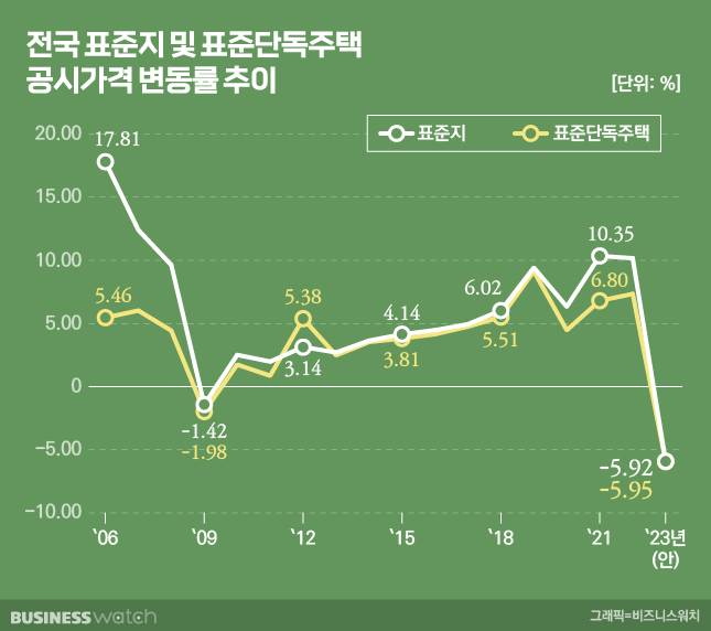 2023년 전국 표준지 공시지가 변동률은 5.92% 내릴 전망이다. 전년(10.17%) 대비 16.09%포인트 감소한 수준이다.