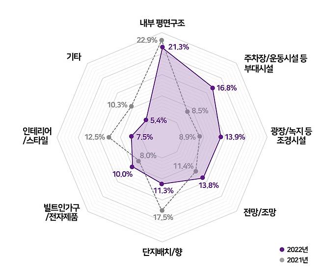 ‘내부 평면구조’는 작년에 이어 올해도 1위를 기록했다. 주차장, 체육시설 등 ‘부대시설’은 작년 6위(8.5%)에서 올해 2위(16.8%)로, ‘조경시설’은 작년 5위(8.9%)에서 3위(13.9%)로 상승했다.