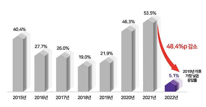 연도별 추이를 자세히 살펴보면 2015년 40.4%를 기록 후 지속적으로 줄어들다가 2018년 19.0%를 찍고 2019년부터 2021년까지 늘어났다가 올해 대폭 줄어들었다.
