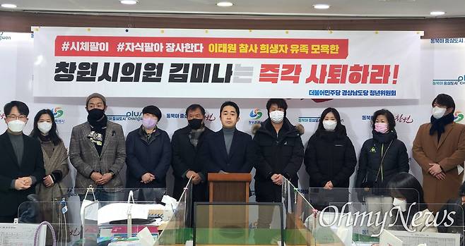| ▲ 더불어민주당 경남도당 청년위원회는 14일 창원시청 브리핑실에서 기자회견을 열어 김미나 의원 사퇴를 촉구했다. |