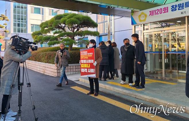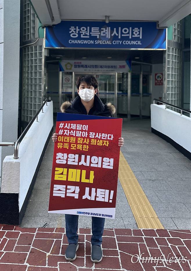 더불어민주당 경남도당 청년위원회는 14일 오전 창원특례시의회 앞에서 사퇴를 촉구하는 1인시위를 벌였다. 이들은 창원시청 브리핑실에서 기자회견을 열어 "창원시민의 대표인 시의원이 창원시민을 욕보이지 말라"며 사퇴를 촉구했다.