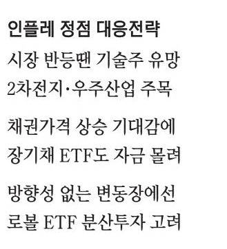 인플레이션이 조금씩 진정되고 금융시장이 안정화된다면 하락장 속에서 그동안 움츠렸던 기술 성장주도 주목할 만하다. 뉴욕 증시는 13일(현지시간) 미국의 11월 소비자물가지수(CPI) 상승률 둔화 등의 영향으로 상승했는데 이에 메타, 엔비디아, 알파벳, 아마존 등 기술 중심의 나스닥종합지수가 1.01% 상승했다. 반면 S&P500지수와 다우존스30산업평균지수는 각각 0.7%, 0.3% 상승하는 데 그쳤다. 국내에서는 2차전지와 우주산업을 비롯해 사이클 산업인 반도체도 대표적인 기술 성장주로 꼽힌다. 희토류와 같이 산업이 성장하는 데 있어 중요한 소재 산업군도 성장이 예상된다. 해당 산업에 투자하는 ETF가 반등할 것이라는 기대가 나오는 이유다. 김성훈 한화자산운용 ETF본부장은 "단순 유행하는 테마가 아닌 향후 성장할 수밖에 없는 산업 섹터군은 ETF 투자를 통해 인플레이션 하락기에 수익률을 끌어올릴 수 있다"고 말했다.