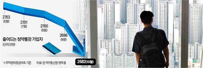 14일 한국부동산원 청약홈에 따르면 10월 말 기준 주택청약종합저축 가입자는 2682만3307명으로 전달(2696만9838명)보다 14만6000여 명 줄었다. 주택청약종합저축이 출시된 2009년 5월 이후 가장 큰 감소폭이다.
