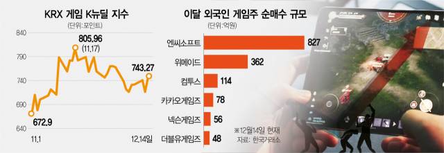 14일 한국거래소에 따르면 이달 외국인 순매수 상위 10개 종목에 게임주 2곳이 이름을 올렸다. 엔씨소프트(036570)는 827억 원으로 순매수 5위에, 위메이드(112040)는 362억 원으로 순매수 10위를 기록했다. 이 외에도 컴투스(078340)(114억 원), 카카오게임즈(293490)(78억 원), 넥슨게임즈(225570)(56억 원), 더블유게임즈(192080)(48억 원)도 사들였다. 외국인은 이달 들어 코스피 시장에서 1조 2036억 원을 순매도하고 있다. 지난달 외국인은 유가증권시장에서 3조 9114억 원을 순매수했다. 지난달 매수 상위 10위에 게임주는 없었다.